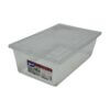 Baúl plástico fabricado en Polipropileno, con tapa abatible asegurada con clips, manillas laterales que son parte del cuerpo y la tapa, 2 ruedas en base inferior, costado derecho.
